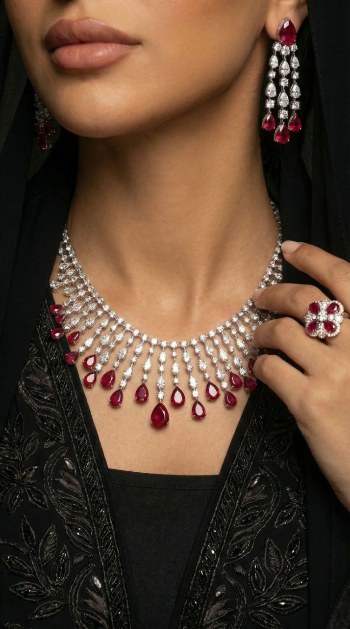 • Design & Artistry: The necklace features a stunning fringe of teardrop-cut ruby red stones, each meticulously framed by a cascade of brilliant cubic zirconia. The matching chandelier earrings and floral-motif ring complete this ensemble, creating a harmonious flow of light and color.