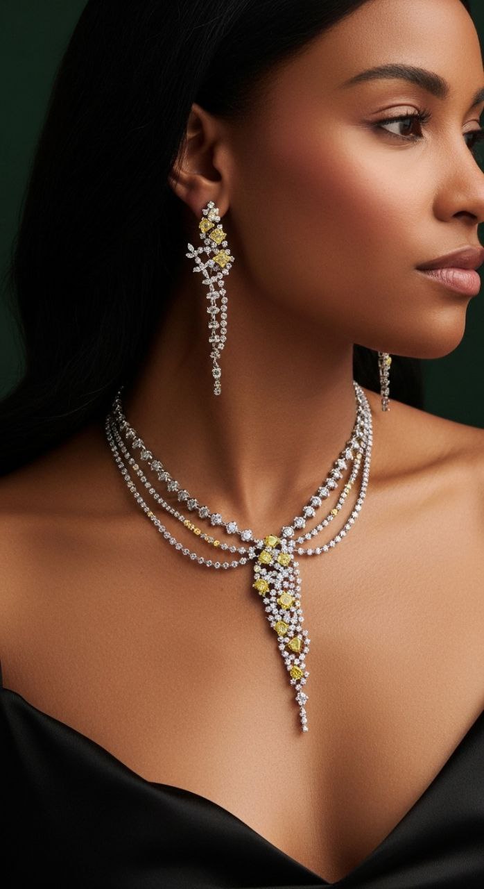 Design & Artistry: The centerpiece is a multi-strand necklace featuring four delicate rows of brilliant-cut cubic zirconia, converging into a stunning geometric drop adorned with vibrant yellow accents. The matching long drop earrings mirror this rhythmic flow, creating a cohesive look of modern grandeur.