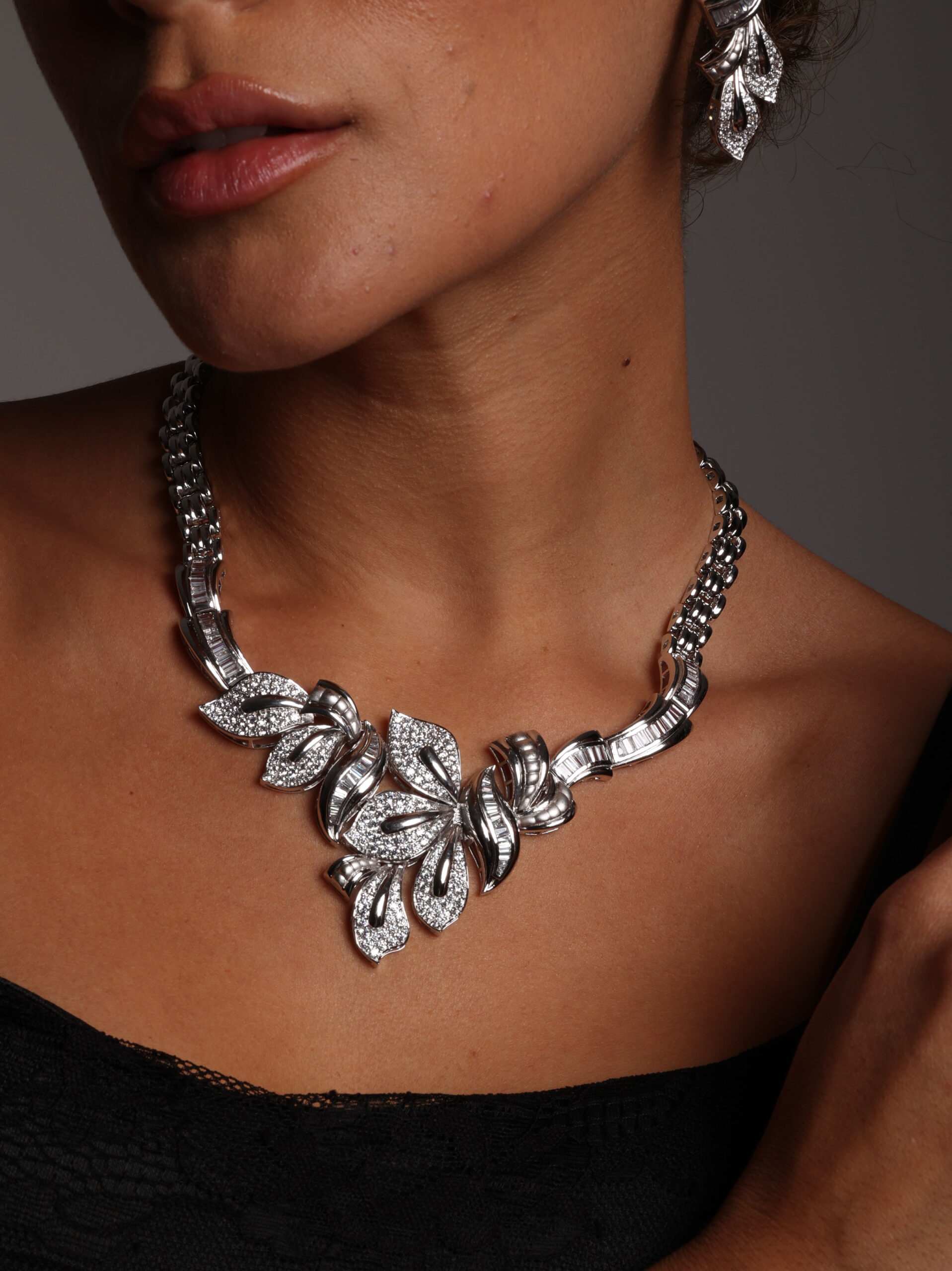 ✨ Make a statement with this exquisite jewelry set, featuring a matching necklace and earrings designed in the shape of delicate leaves. Each piece is encrusted with shimmering stones that resemble diamonds, adding a touch of glamour and sophistication to your look.
