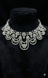 • Design & Artistry: The collection features a magnificent scalloped design, with cascading silver arches entirely encrusted with brilliant-cut cubic zirconia. The intricate interplay of open-work and shimmering stones creates a lace-like effect that rests gracefully on the neckline.