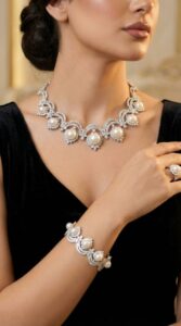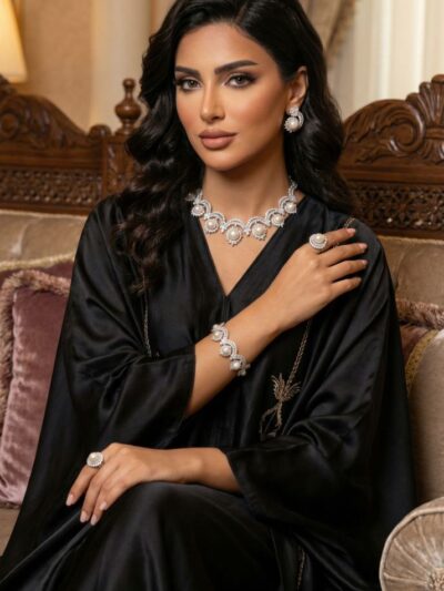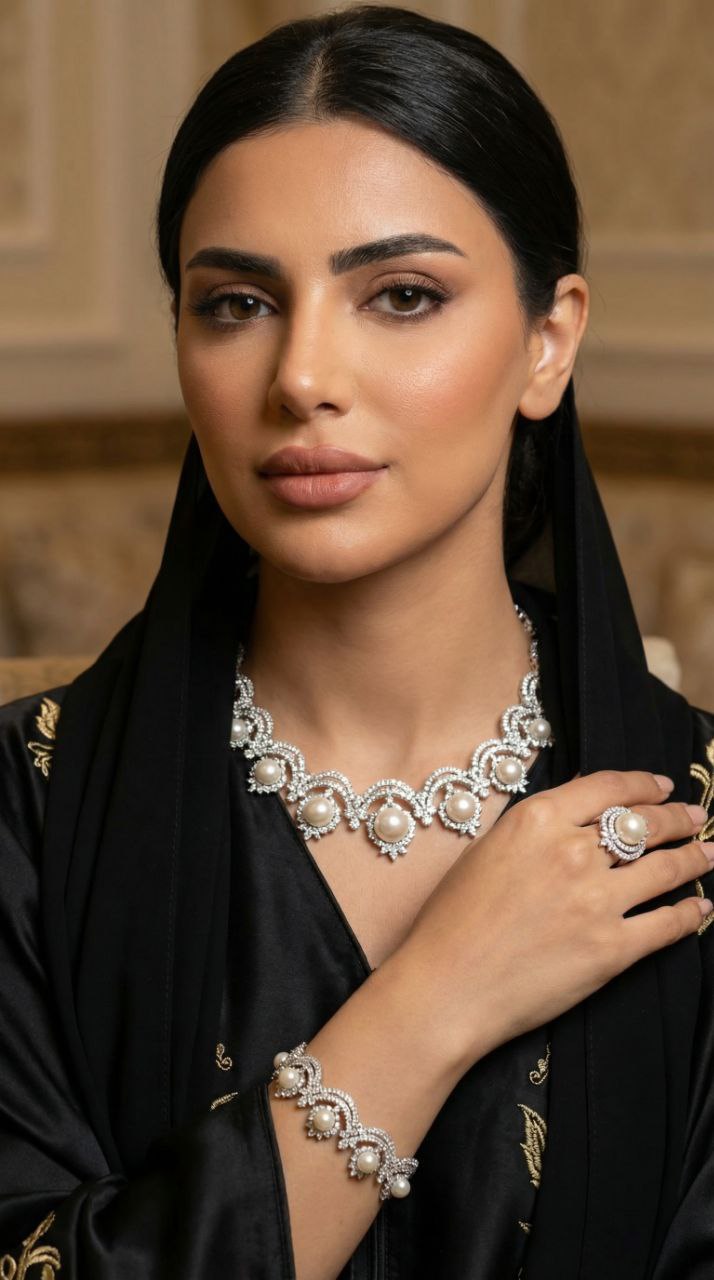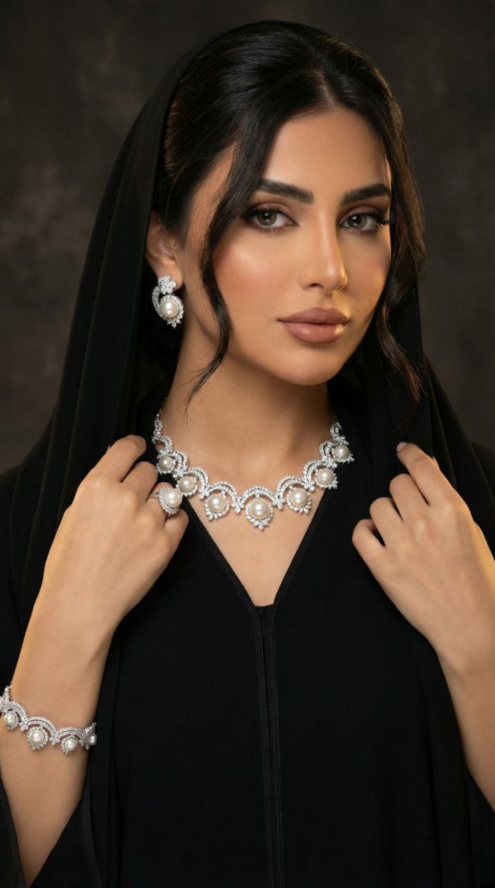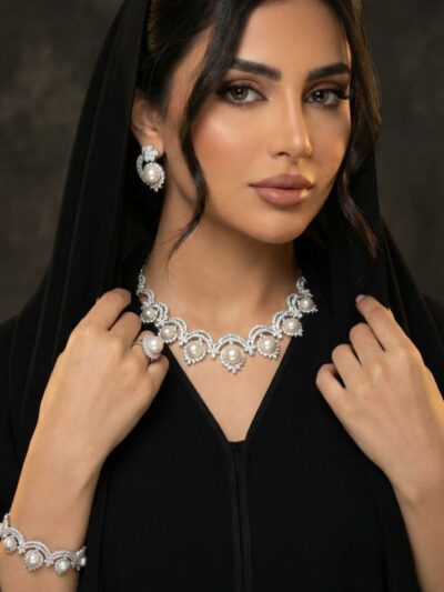 Embrace the heritage of elegance with the Jumeirah Collection. Crafted from high-quality 925 Sterling Silver, this set is a celebration of the sea’s most precious gift—the pearl. Its majestic, curved motifs evoke the gentle waves of the Gulf, making it a statement of grace and tradition.