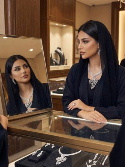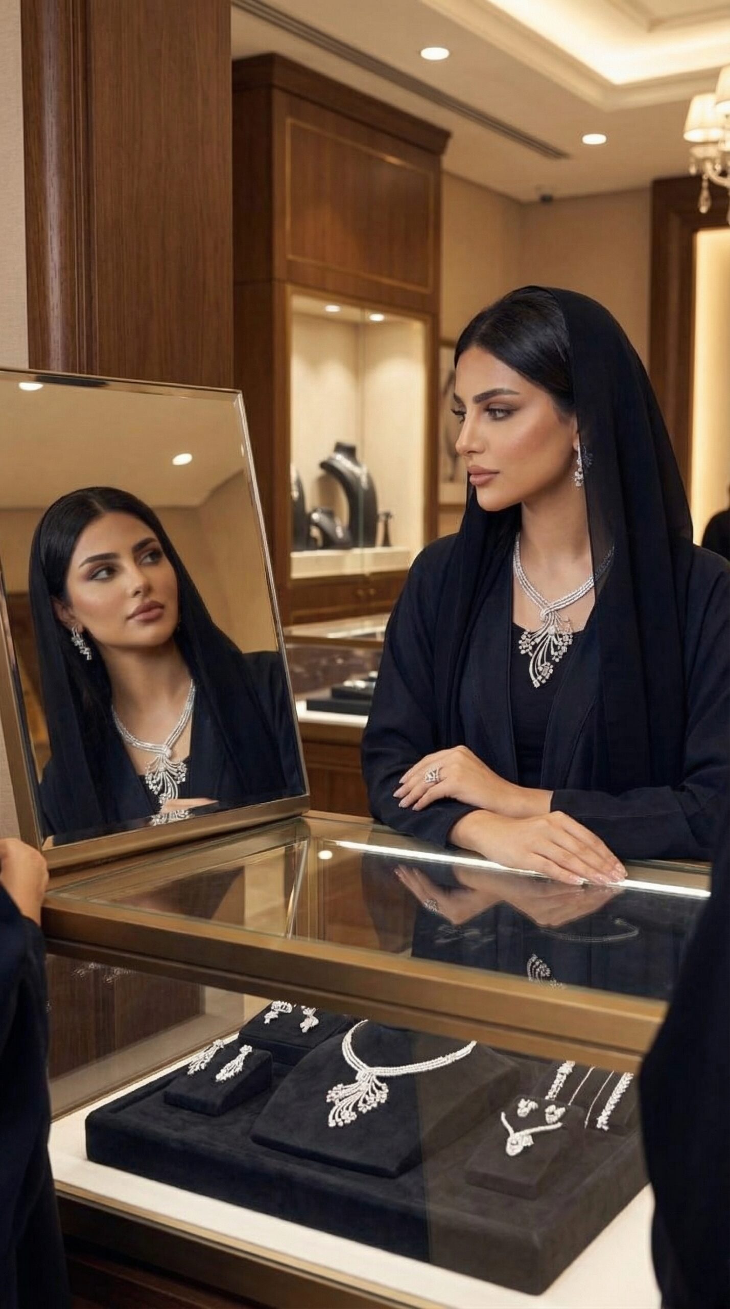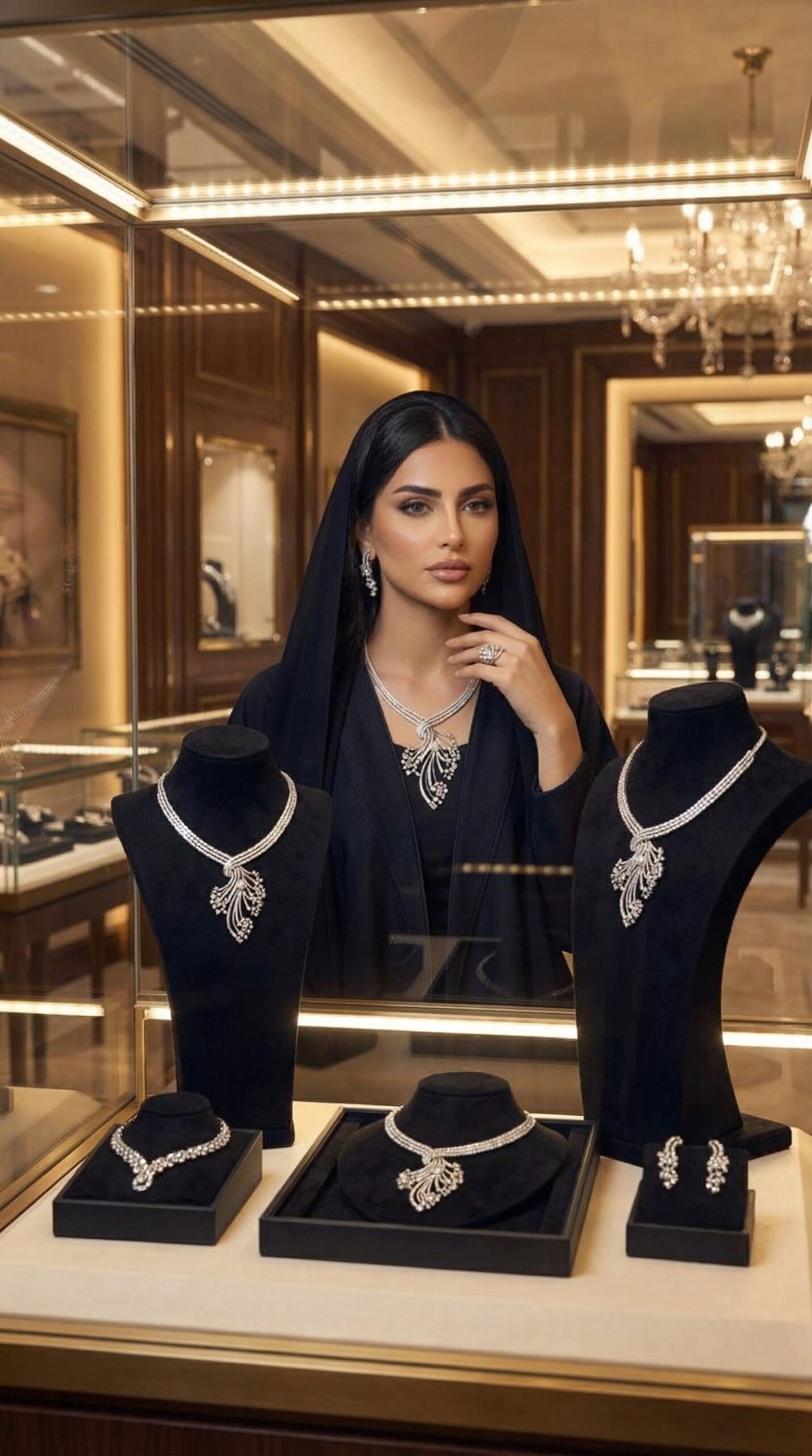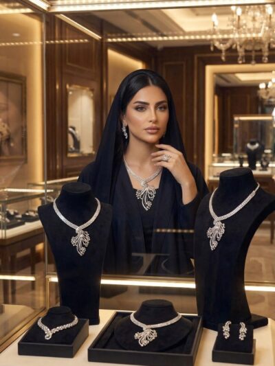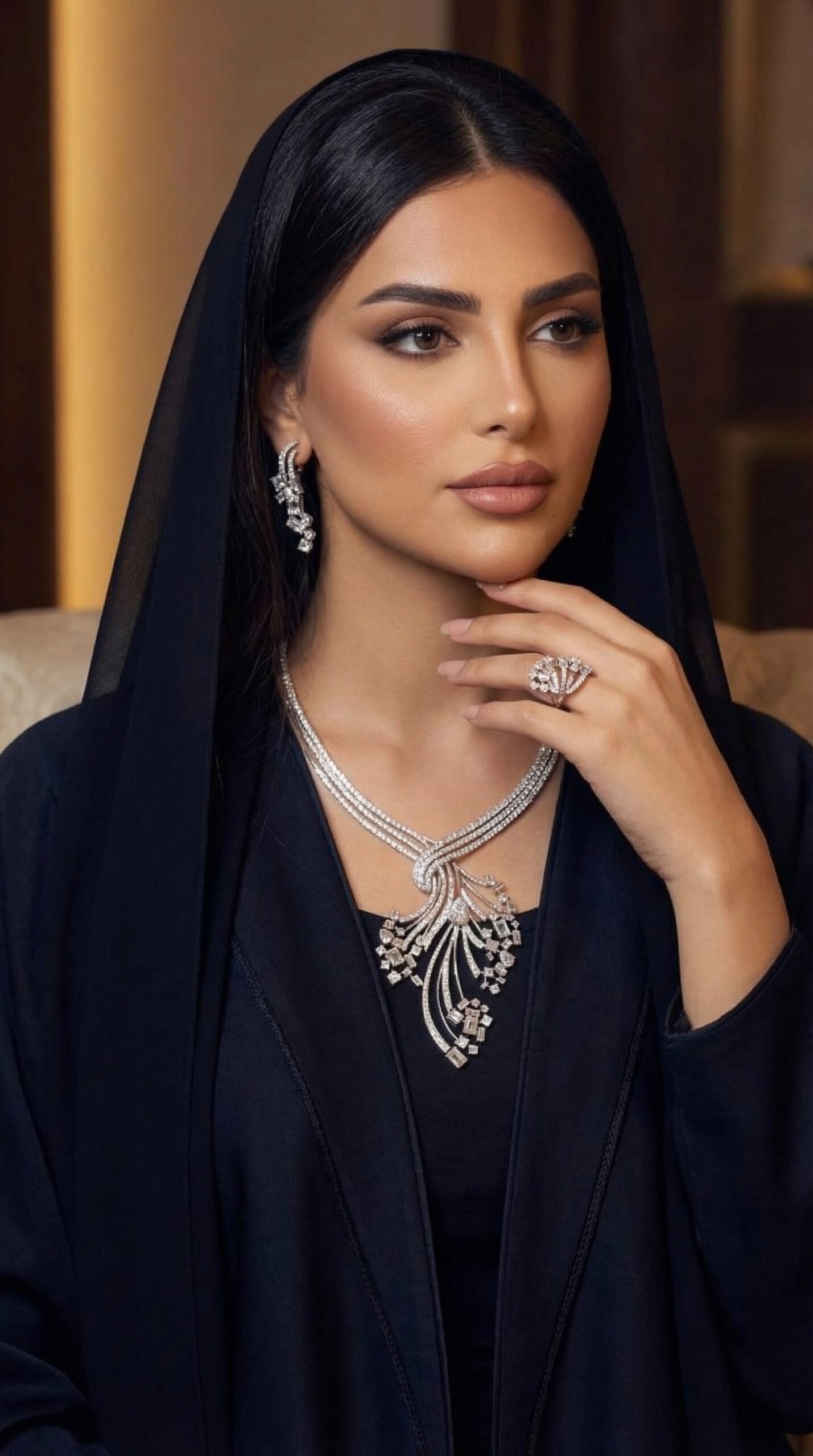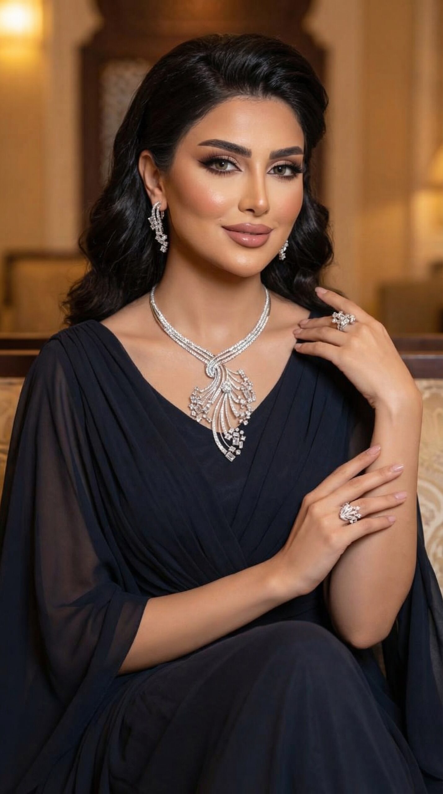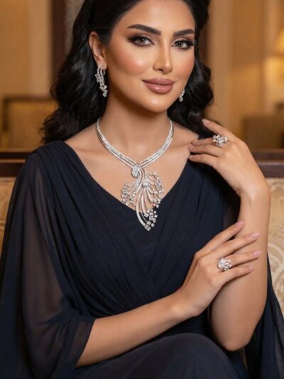 The Design: This masterpiece features a unique “Waterfall” silhouette. The necklace begins with triple-layered sleek bands that converge into a stunning focal point, bursting into shimmering trails of brilliance.