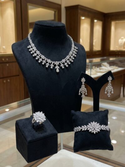 The Full Ensemble: This luxury set includes the signature cascading necklace, matching chandelier earrings, a delicate bracelet, and an adjustable statement ring.