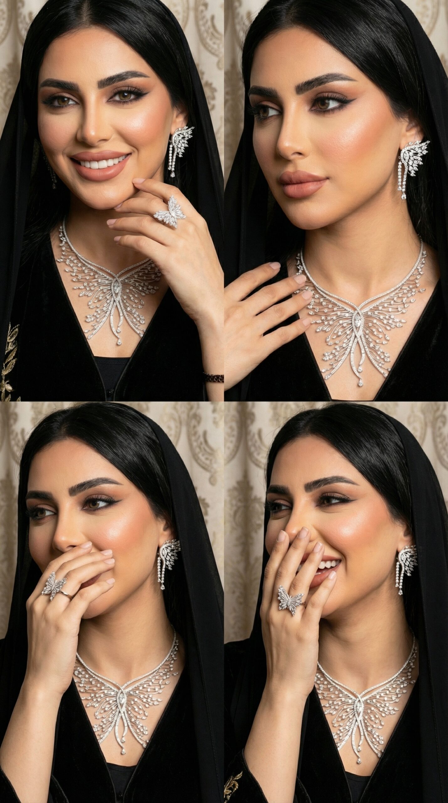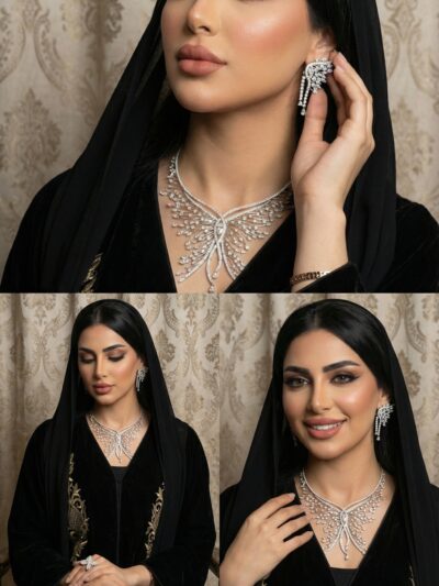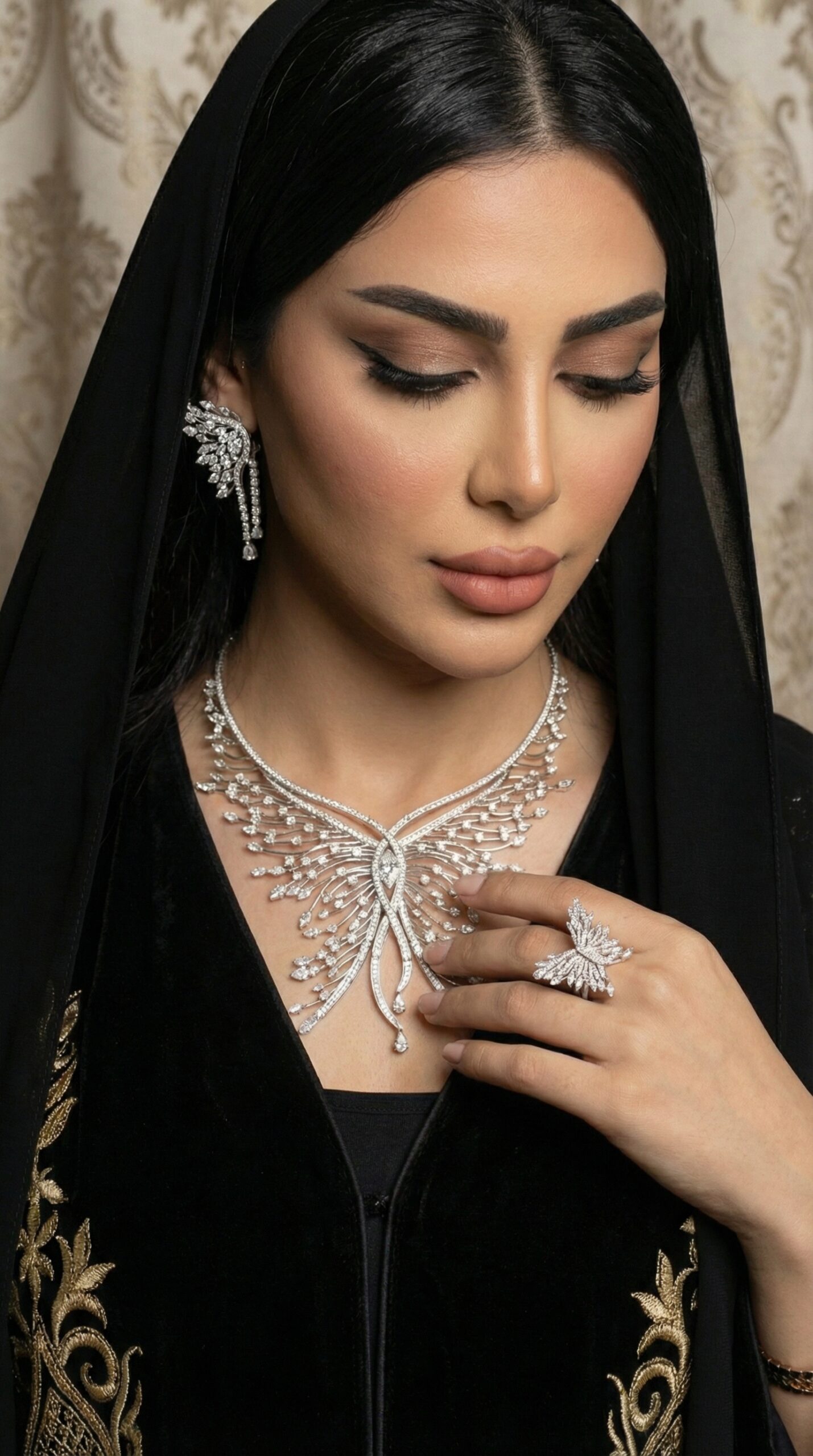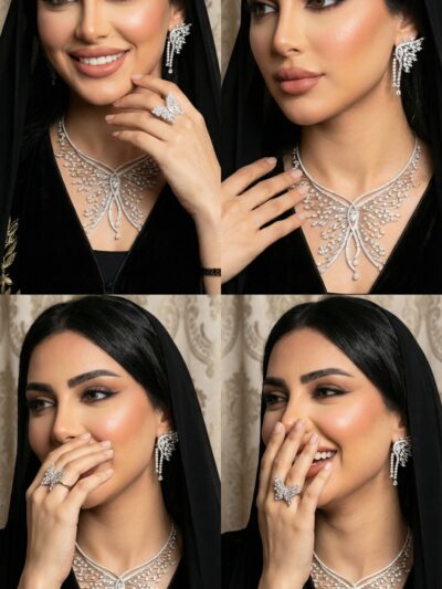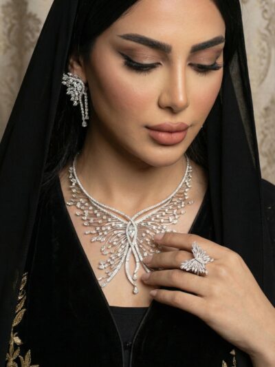 Intricate Detail & Radiance The necklace, ring, and earrings are adorned with brilliant, precision-cut stones that capture and reflect light from every angle, mimicking the shimmer of morning dew on delicate wings. Whether for a gala or an intimate evening, this set offers a bold yet sophisticated statement of luxury.